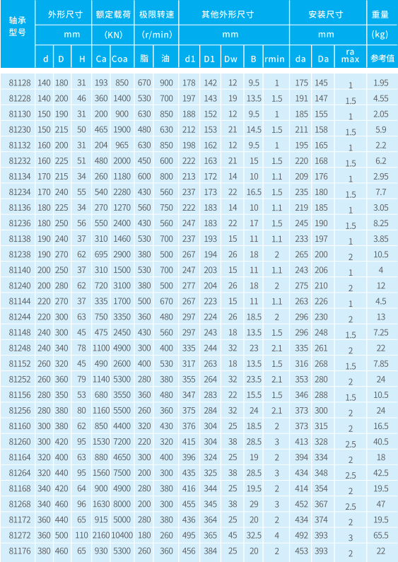 推力圓柱滾子軸承由推力圓柱滾子和保持架組件、底圈和軸圈組成。軸承具有很小的軸向截面高度、高承載能力、高剛度并能承受一個(gè)方向的軸向力。